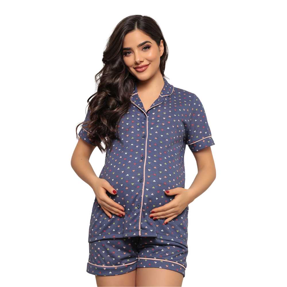 A estampa de corações traz um toque fofo ao pijama, que contrasta com os detalhes em rosa.