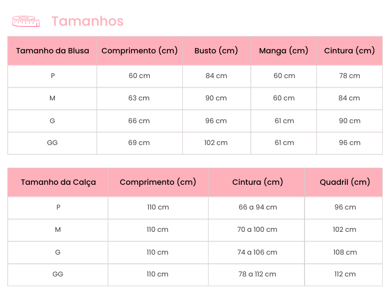 Já a calça longa, com cós elástico e boca ampla, acompanha o corpo com suavidade, sem apertar. O detalhe bordado na barra complementa o conjunto com charme e delicadeza.