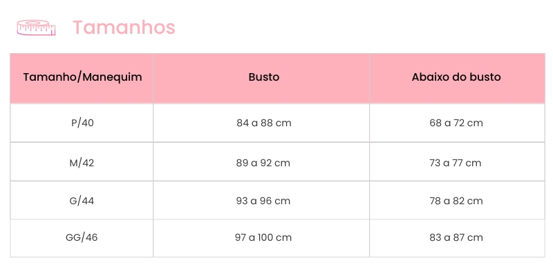 Com bojo e arco que proporcionam sustentação e modelagem natural, o sutiã possui bojo com leve enchimento nos tamanhos P e M, oferecendo mais volume e firmeza, e bojo liso no tamanho GG, que modela suavemente sem alterar a anatomia dos seios.