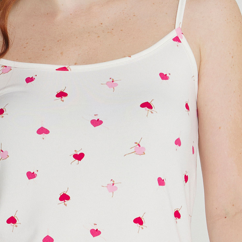 A blusa apresenta modelagem de alcinha, na cor off-white, com estampa total de corações e bailarinas, trazendo um visual romântico e divertido.